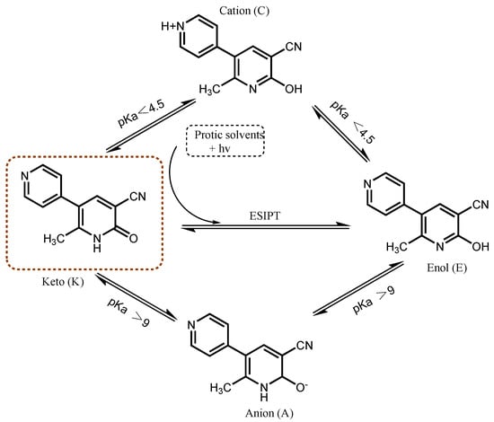 The pH of the medium can seriously affect the structural form of MLR [9] (Figure 1). At a neutral pH, under physiological conditions, the keto structure predominates. Following exposure to an acidic environment, it appears as a cation. Both the keto and cationic structures are the active forms of the MIR inotropic agent [10,11]. The efficient non-radiative relaxation for the tautomeric structures of MIR is interpreted in the fields of H-bonding, charge-transfer (ICT), and the twisting motion of the functional group [12]. It is these mechanisms that make it have the critical features for the biologic activity of keto and cation structures [13]. However, a great deal of investigations into the oral use of MLR revealed that thrombocytopenia is related to the adverse side effects of MLR. It is clear that the active forms of MLR employed for the therapy of cardiac disease are keto (K) and cation patterns [14,15]. Although the biologic activity of MIR depends on its ground state, light may have a great influence on its tautomerization and it is worthwhile to study its photodynamics. Actually, some adverse side effects are associated with the tautomers of MLR resulting from oral preparation processing or gastrointestinal digestion [16,17]. The data of the short time scale results may allow for a better understanding of its interaction with solvents, and for elucidating possible sources of the main degradation channels of MLR. Consequently, the monitoring of tautomers of MLR is also of great urgency.