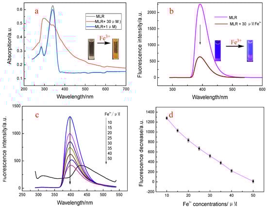 Considering the multiple coordination sites, we investigated the sensing properties of MLR to Fe3+. Figure 3a presents the absorption spectra of MLR and the MLR with the addition of Fe3+ ions. It shows that the absorption peak of MLR at 332 nm decreased appreciably with the addition of Fe3+ ions, while the absorption band at 280 nm was significantly enhanced. These results underwent that the conversion of the free MLR to the corresponding MLR–Fe3+ complexes carried out. The absorption change at 332 nm could be attributed to the suppression of the ESIPT reaction in the MLR–Fe3+ complexes. The enhanced absorption may be attributed to the absorption of the MLR–Fe3+complexes at 280 nm.