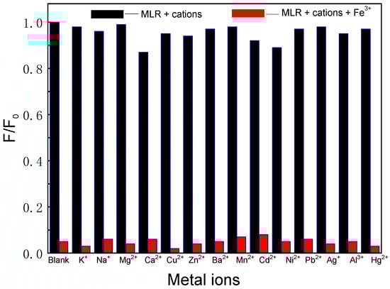 The selectivity of MLR towards cations was also evaluated using fluorescence spectroscopy (Figure 5). No significant fluorescence change was observed in the presence of common cations (K+, Na+, Ca2+, Zn2+, Mg2+, Ba2+, Pb2+, Ni2+, Mn2+, Cd2+, Cu2+, Co2+, Al3+, and Hg2+). The addition of Fe3+ in the test system caused obvious change in the normal emissions. When the coexisting metal ions with the same concentration were added to this system, no change in the fluorescence intensity was observed. These results clearly demonstrate that the MLR had a high selectivity to Fe3+ compared with most other competitive metal ions.