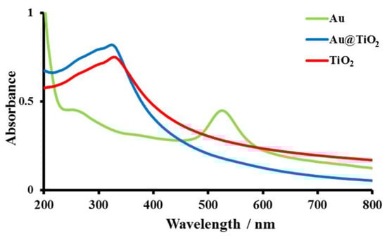In order to ensure the success of Au@TiO2 preparation, UV-Visible absorption spectra were recorded for AuNPs, TiO2 and Au@TiO2. As shown in Figure 1, in the case of AuNPs, the spectrum showed the characteristic absorption peak at 524 nm. TiO2 nanoparticles are commonly used as an additive in most sunscreen formulations due to their broad absorption within the UVB and UVA region, with a maximum of 327.5 nm. The successful preparation of Au@TiO2 was accompanied and confirmed by the disappearance of the AuNPs peak, which is attributed to the complete coverage of the core (Au) by the TiO2 shell. Moreover, a slight blue shift was observed from 327.5 nm to 323.5 nm.