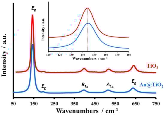 The TiO2 and Au@TiO2 materials were characterized by Raman spectroscopy, and the associated spectra are shown in Figure 2. The existence of bands at 144 (Eg), 198 (Eg), 396 (B1g), 515 (A1g) and 638 (Eg) cm−1 are unquestionably linked to the TiO2 anatase phase [,,]. In the case of Au@TiO2, the typical Eg peak of TiO2 at 144 cm−1 shifted to a higher wavenumber (146 cm−1), indicating more crystalline disorders in the anatase TiO2. These crystalline disorders, which developed at the point where Au and TiO2 came into contact, impact the vibrational frequency of anatase TiO2 and serve as traps for the produced photoelectrons.