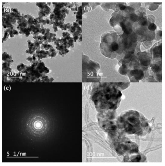 TEM images of (a,b) Au@TiO2 with 8.14% Au; (c) selected area electron diffraction pattern; (d) TEM image of Au@TiO2/MWCNTs composite material.