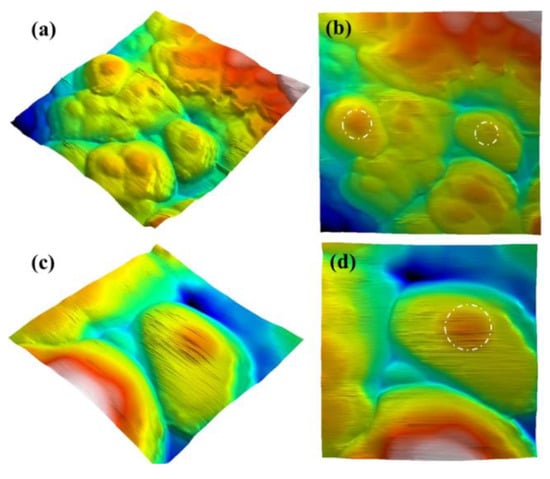 AFM images of the core–shell Au@TiO2 material; (a,c) 3D images and (b,d) plane images.