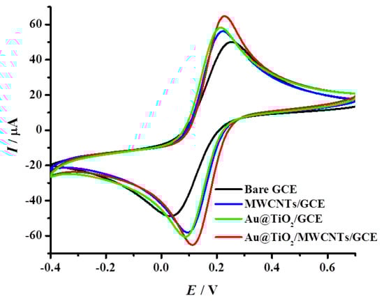 Cyclic voltammetric responses for bare GCE, MWCNTs/GCE, Au@TiO2/GCE and Au@TiO2/MWCNTs/GCE in 5 mM [Fe(CN)6]3−/4−/0.1 M KCl at a scan rate of 100 mV/s.