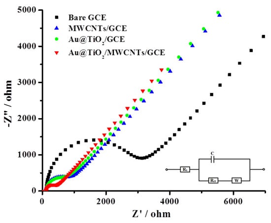 EIS analysis was performed and recorded in 5 mM [Fe(CN)6]3−/4− solution at 0.22 V with a frequency range from 0.1 Hz to 105 Hz (Figure 9 and Table 1) to support the cyclic voltammetry results and to confirm the Rct values which agree well with the voltammetry findings. The bare GCE showed an Rct of 2610 Ω, which was decreased very significantly (634 Ω) after modifying the GCE surface with MWCNTs. This is due to the reason that the electron process kinetics is faster due to the high electrical conductivity of MWCNTs, which ultimately facilitates the electron transfer and decreases the resistance. Au@TiO2-modified GCE also showed a decrease in the Rct value (529 Ω), but the proposed electrode material Au@TiO2/MWCNTs/GCE exhibited the best and lowest charge transfer resistance (281 Ω) among all the tested materials and is attributed to the synergistic effect of the core–shell Au@TiO2 nanostructure and high conductivity of MWCNTs.