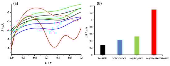 (a) Differential pulse voltammograms recorded in PBS (dashed lines) and 300 µM H2O2 (solid lines) for various stages of electrode modification, Bare GCE (black); MWCNTs/GCE (blue); Au@TiO2/GCE (green); Au@TiO2/MWCNTs/GCE (red). (b) Histogram represents the corresponding change in current values (ΔI).