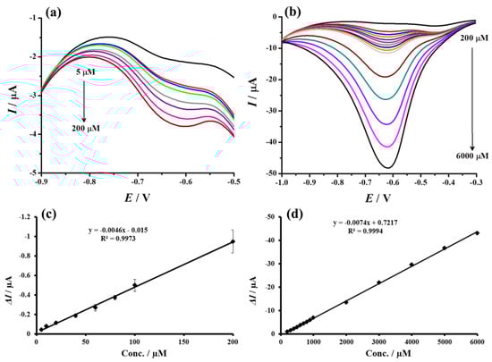Differential pulse voltammograms recorded using proposed sensor (Au@TiO2/MWCNTs/GCE towards different concentrations of H2O2 (a) 5 to 200 µM and (b) 200 to 6000 µM) in N2-saturated PBS (pH 7.4)). (c,d) Corresponding calibration curves from the current responses vs. H2O2 concentrations plot.