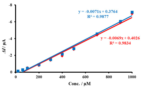 Stability study for the determination of H2O2 (20–1000 µM) after 50 days (red line) using the proposed sensor (Au@TiO2/MWCNTs/GCE) compared to the response observed initially (blue line).