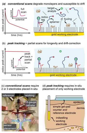 Improvements to traditional sensing techniques through software improvements. (a) Conventional E-AB methods susceptible to electrochemically accelerated monolayer desorption and monolayer fouling that can reduce signal and utility whereas (b) automatic-peak-tracking improves sensor longevity. (c) Conventional in vivo EAB sensing requires more complicated 3-electrode placement inside the body, reproduced from [12] compared to (d) auto-peak tracking EAB allows simplified use of a single working electrode in the body.