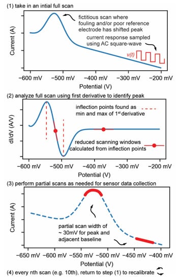 Software process for identifying peaks to generate partial scanning windows. (Step 1) Acquire voltammogram from a full scan that is not centered and is sloped. (Step 2) Take the first derivative in pursuit of the maximum and minimum values (i.e., inflection points). (Step 3) Center voltammogram peak and reduce scanning windows to baseline and peak based on inflection point potentials. (Step 4) Repeat every n scans to maintain centered peak.