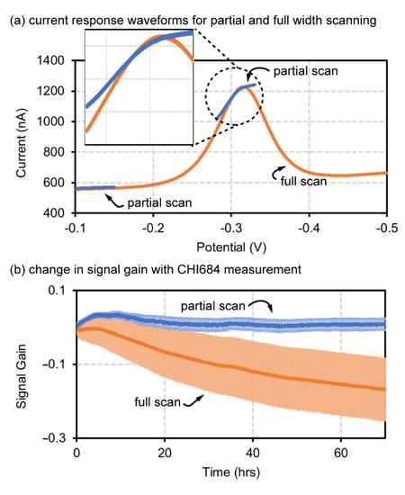 Comparing full and partial scanning voltammograms (Figure 3a), the partial scanning peak has less of a parabolic shape compared to full scanning which we speculate is due to a population shift of the methylene blue redox tag oxidation vs. reduction state compared to a full scan. As shown in Figure 3b where five sensors were tested for partial and five for full scanning longevity tests, the full width scan, had ~20% loss in signal over 900 scans and 72 h while the partial scanning test maintained signal integrity and exhibited a much smaller standard deviation for each scan within the same time period (Figure 3b). The data shown in Figure 3 were obtained using the CHI684 potentiostat and were also repeated with the Cassio board potentiostat with similar results (Figure S3).