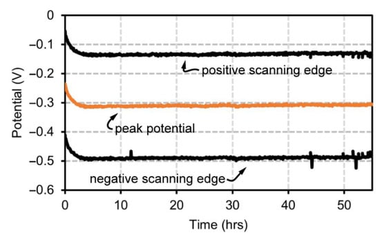 Next, to validate the software’s ability to track peaks and drift, a gold rod (disk) electrode was used as a pseudoreference electrode alongside a platinum counter electrode, all placed in bovine serum (Figure 4). The bare gold surface of the reference electrode is prone to rapid adsorption of proteins in serum which will significantly alter the electrical characteristics of the system causing potential drift. These tests were performed at 37 °C to mimic body conditions and hermetically sealed to prevent water loss due to evaporation. The software is expected to closely monitor the peak over the duration of any test and should not egregiously widen scanning windows into monolayer destructive voltage regions. This test did not incorporate the partial scanning function and will therefore also have loss in signal gain like in static, full scan width tests. The Cassio board potentiostat was programmed with an initial potential window of −100 to −500 mV, to be modified via software as biofouling occurs at the bare gold reference. The Cassio board was used for this test because the macro commands for the CHI684 are limited and cannot be easily modified with the peak tracking function. Over 4 days of testing and ~800 scans, the software successfully maintained the peak within the potential scanning window and the scanning window maintains similar width and relative location around the peak over the course of the experiment. The rapid initial biofouling in the first ~50 scans (2 h) is also tracked within the scanning window without failure (Figure 4).