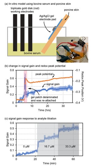 Simulated in vivo environment results. (a,b) Signal gain degradation and peak potential drift of simulated in vivo model using the peak-tracking software with porcine skin in bovine serum as a model for dermal interstitial fluid biosensing. (c) Signal response of peak-tracking software during vancomycin titration.
