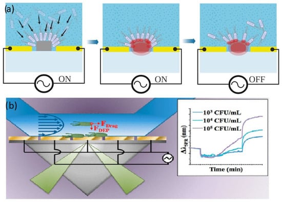 - Galvan, D.D.; Parekh, V.; Liu, E.; Liu, E.-L.; Yu, Q. Sensitive Bacterial Detection via Dielectrophoretic-Enhanced Mass Transport Using Surface-Plasmon-Resonance Biosensors. Anal. Chem. 2018, 90, 14635–14642. [Google Scholar] [CrossRef]