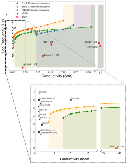 - Zhang, P.; Liu, Y. DC biased low-frequency insulating constriction dielectrophoresis for protein biomolecules concentration. Biofabrication 2017, 9, 45003. [Google Scholar] [CrossRef]