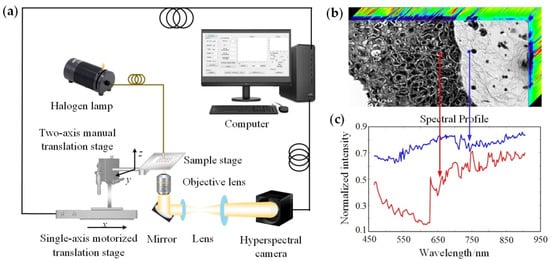 HMI system and data analysis. (a) Schematic diagram of the push-broom HMI system; (b) HMI data cube; (c) spectral profiles corresponding to the marked points in (b), the red and blue spectral curves corresponded to the red and blue points, respectively.