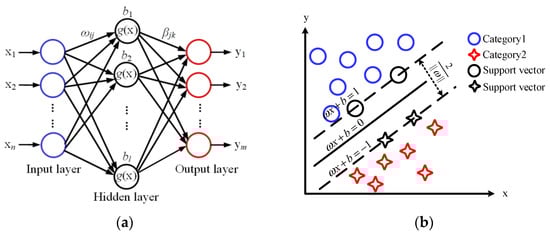 The basic principle of the SVM algorithm is shown in Figure 2b. By solving the optimal hyperplane, the training dataset can be partitioned correctly and the geometric interval can be maximized. In the SVM algorithm, choosing the appropriate kernel function can effectively guarantee the classification accuracy. In this paper, the linear kernel function was selected after many repeated experiments.