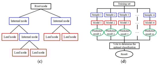 A decision tree is a predictive model expressed in the form of a tree diagram, as shown in Figure 2c. A decision tree classifier includes root nodes, internal nodes and leaf nodes. In the process of generating a decision tree, three problems need to be solved: which feature to be chosen as the root node, which features to be chosen as the internal nodes, and when to stop splitting child nodes and achieve the stated goal.