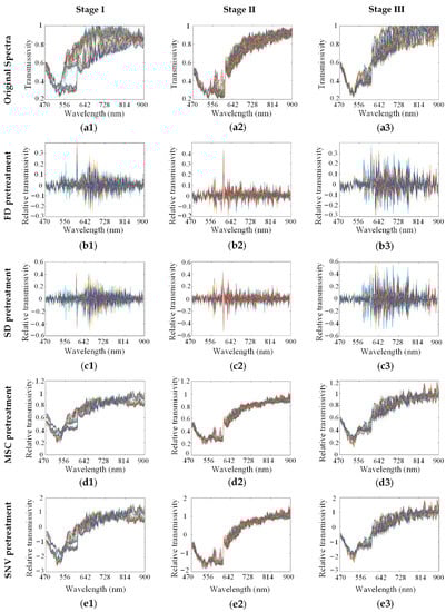 We used various methods to preprocess the spectra from the HMI data cube. As shown in Figure 3, the original spectra (a1–a3) of SCC at stage I, stage II and stage III in the SK801c tissue microarray were pretreated by FD (b1–b3), SD (c1–c3), MSC (d1–d3) and SNV (e1–e3), respectively. The effects of the preprocessing methods on modeling are discussed in the following process.