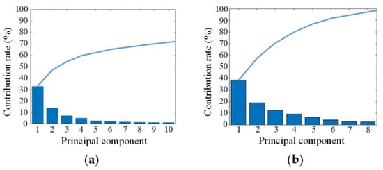 Principle component contribution rates with different dimensionality reduction methods. The columns represented the contribution rates of every principle component, and the lines represented the corresponding cumulative contribution rates. (a) PCA; (b) PLS.