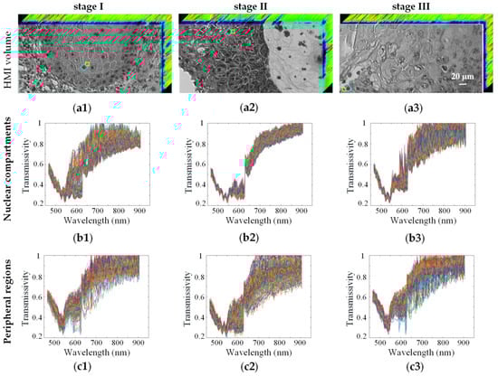 HMI images and original spectra of SCC at different clinical stages: stage I, stage II and stage III, respectively. (a1–a3) 3D HMI images. “◇”, “○” and “□” represented the selected spectral ROIs including the nucleus and surrounding areas, the nuclear compartments, and the peripheral regions, respectively; (b1–b3) original spectra of the nuclear compartments; (c1–c3) original spectra of the peripheral regions. The different color lines represented the spectra of different sample pixels of the ROIs.
