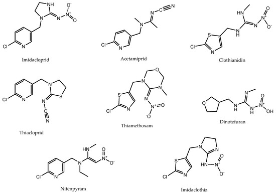 Chemical structures of the eight most relevant neonicotinoid pesticides.