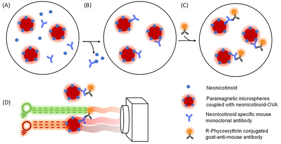 Assay and detection principle of the neonicotinoid microsphere immunoassays (nMIAs). OVA–neonicotinoid conjugates that are coupled microspheres are incubated with specific neonicotinoid antibodies and a sample containing free neonicotinoids. The OVA–neonicotinoid conjugates and free neonicotinoids compete in antibody binding (A). After incubation, the unbound antibodies and neonicotinoids are washed away (B). When it is incubated with an uncontaminated sample, the neonicotinoid antibody binds to the OVA–neonicotinoid conjugates on the microspheres, while fewer antibodies are bound to the microsphere when they are incubated with a neonicotinoid-contaminated sample. Next, an ample number of secondary anti-species antibodies that are coupled to R-phycoerythrin are incubated with the OVA-neonicotinoid-antibody complex and the excess is washed away (C). The microspheres contain two unique fluorochromes which emit red and far-red light upon excitation by a red LED. These emissions are captured using the CCD camera in the planar array reader for microsphere identification. Next, the intensity of the orange-emitted light from the reporter is measured after excitation by the green LED (D).