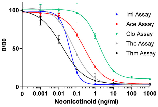 Dose-response curves in PBST-BSA buffer for the five neonicotinoid profiling assays (nMIAs) for detecting their corresponding neonicotinoid targets (n = 2).