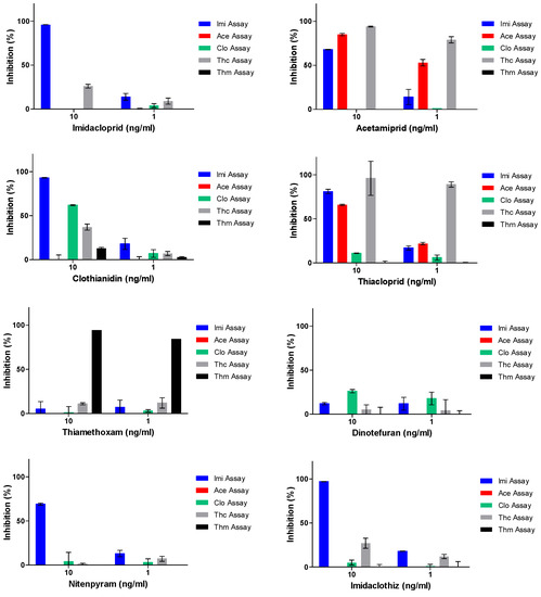 Neonicotinoids are polar molecules that are soluble in water and therefore, they are easily spread through the environment. With surface water being an important factor in the bee environment, we fortified tap water with the eight individual neonicotinoids at concentrations of 1 ng/mL and 10 ng/mL. The fortified tap water samples were further diluted 10-fold with tap water to anticipate the presence of future surface water samples that may contain disturbing matrix contents. The fortified water samples, that were diluted in blank tap water, were measured in all five of the nMIAs. Blank tap water was also used as a blank control. The results, which are displayed in the inhibition-based graphs, are shown in Figure 4. For each assay, the cut-off level for a screen-positive detection was set at 20% inhibition. All the fortified neonicotinoid samples were detected in one or more nMIAs. The best-achieved sensitivities for all of the tested neonicotinoids in water were 1 ng/mL for imidacloprid with the Imi assay, acetamiprid with the Ace assay, thiacloprid with the Thc assay, thiamethoxam with the Thm assay and dinotefuran with the Clo assay; 10 ng/mL for clothianidin with the Imi assay, nitenpyram with the Imi assay, and imidaclothiz with the Imi assay (Table S4). Nevertheless, neonicotinoids that are found in large, natural waterbodies are usually present at trace levels due to there being large volumes and movements. For instance, Mahai et al. applied LC-MS/MS to screen water from the central Yangtze River, China, and they reported that there were various levels of imidacloprid, acetamiprid, thiamethoxam, nitenpyram, clothianidin and thiacloprid contaminations with the medians of 4.37 ng/L, 2.50 ng/L, 1.10 ng/L, 0.34 ng/L, 0.10 ng/L and 0.02 ng/L, respectively [50]. Trace-level concentrations of neonicotinoids like these are unfortunately undetectable with nMIAs unless preconcentration steps are implemented.