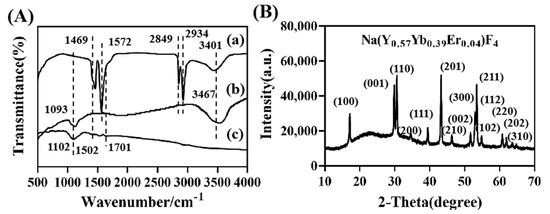 FTIR spectra of OA−UCNPs (a), ADA−UCNPs (b), UCNPs−COOH (c) (A); XRD patterns of UCNPs (B).