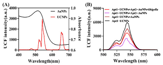 Fluorescence spectra of UCNPs and UV-Vis absorption spectra of GNPs (A); fluorescence spectra of apt2−UCNPs with addition of GNPs, apt1−GNPs, and apt1−GNPs−Shigella (B).