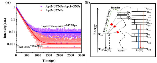 Fluorescence lifetimes spectra of apt2−UCNPs and apt1−GNPs−apt2−UCNPs (A); plausible energy transfer mechanism from Na(Y0.57Yb0.39Er0.04) YF4 to GNPs (B).
