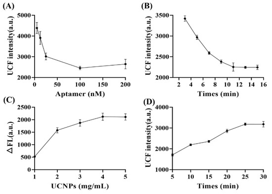 Optimized condition of apt1 (A), the incubation time of apt1−GNPs (B), apt2−UCNPs (C), and the incubation time between the probe and Shigella (D).
