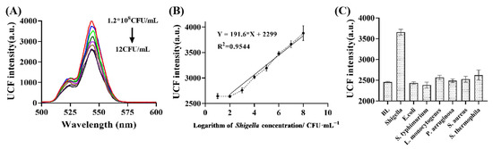 Under the optimized conditions, the fabricated upconversion fluorescence probe was used to detect Shigella. As seen in Figure 7A, the upconversion intensity at 545 nm increased with the increased concentration of Shigella. This phenomenon was ascribed to the apt1 firmly adhered to the surface of bacteria, and the GNPs fell from the surface of apt−UCNPs. The higher the Shigella concentration, the more GNPs fell from the apt2−UNCPs surface; thus, a higher fluorescence signal can be acquired. A linear relationship was obtained between the upconversion intensity at 545 nm and the Shigella concentration. Density ranged from 1.2 × 102 to 1.2 × 108 CFU/mL (Figure 7B). The linear equation was Y = 2299 + 191.6 X, with R2 = 0.9544 (Figure 2B). The limit of detection (LOD) of the fabricated upconversion fluorescence probe was determined to be 30 CFU/mL, based on the formula of LOD = 3 Sa/Sb (3 is the factor at the 99% confidence level, Sa is the standard deviation of 10 blank upconversion fluorescence measurements, and Sb is the slope of the Shigella detection calibration plot). Furthermore, in comparison with the linear range, LOD and detection time of the developed upconversion fluorescence probe with other reported methods [33,34,35,36,37,38] confirmed that the probe can achieve Shigella detection with high sensitivity and meets the requirements for contaminated sample detection (Table 1).