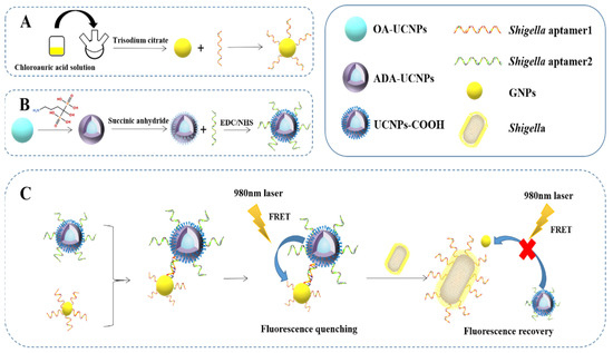 Schematic description of GNPs−UCNPs fluorescence nanoprobe for detection of Shigella.