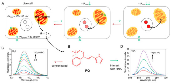 Principle of the reversibly migratable fluorescent probe PQ for the evaluation of MMP. (A,B) Schematic illustration of PQ migration between mitochondria and nucleolus and the chemical structure of PQ; (C) fluorescence spectra of PQ for increasing concentrations (2.5, 5, 10, 20, 40, 60, 80, 100 µM from bottom to top) in aqueous solution mimicking high concentrations in mitochondria with high MMP; (D) the fluorescence spectra of PQ at relatively low concentrations (0, 1, 2.5, 5, 10 µM from bottom to top) in 0.5 mM yeast RNA, mimicking the interaction between PQ and RNA in nucleolus under decreasing MMP.