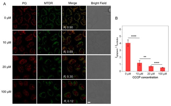 To verify mitochondria localization and response to MMP, co-staining with commercial mitochondria probe MTDR was carried out with different concentrations of carbonyl cyanide-m-chlorophenylhydrazone (CCCP, a protonophore that can collapse MMP) [,,] to tune the MMP of live cells (Figure 2). In live cells without CCCP, the fluorescence of PQ overlapped with that of MTDR, and the Pearson correlation coefficient (Rr) is 0.90. As the CCCP concentration increased from 10 to 20 and 100 μM, nucleoli fluorescence became stronger, but cytoplasm fluorescence was weaker. Rr decreased to 0.69, 0.30, and 0.12, respectively, indicating that PQ molecules tend to escape from mitochondria when MMP decreases. In order to quantify the translocation of PQ, the mitochondria were isolated from PQ-stained cells before and after fixation and the absorption spectra of mitochondrial lysates were measured (Figure S6). Compared with live cells with high CCCP, the absorbance of PQ in mitochondria isolated from fixed cells with vanished CCCP decreased by ~81%, which demonstrates that most PQ molecules left mitochondria once MMP was dissipated. The ratio of mean fluorescence intensity of cytoplasm and nucleolus (Icytoplasm/Inucleolus) was calculated, and it decreased distinctly with the drop of MMP caused by the increase of CCCP concentration (Figure 2B).