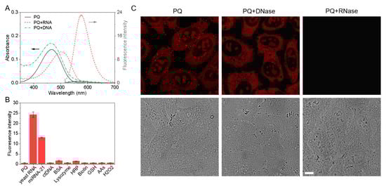 RNA selectivity. (A) UV–vis absorption and fluorescence spectra of 5 µM PQ in the presence of RNA/DNA. The black arrow means “using the left coordinate axis”, and the grey arrow means “using the right coordinate axis”; (B) Fluorescence comparison of 5 µM PQ in the presence of yeast RNA (1.0 mM phosphate), miRNA-21 (48 µM phosphate), ctDNA (1.0 mM phosphate), proteins (1.0 mg/mL), biotin (10 mM), glutathione (GSH, 10 mM), amino acids (10 mM) and H2O2 (10 mM) in PBS. The proteins include bovine serum albumin (BSA), lysozyme (Lyso), and horseradish peroxidase (HRP). The amino acids (AAs) include homocysteine (Hcy), cysteine (Cys), glycine (Gly), alanine (Ala), norvaline (Nor), glutamic acid (Glu), histidine (His), isoleucine (Iso), leucine (Leu), methionine (Met), phenylalanine (Phe), proline (Pro), serine (Ser), threonine (Thr), tryptophane (Try), and tyrosine (Tyr). Data represent mean ± SD (n = 3); (C) CLSM images of PQ in the fixed HeLa cells with or without DNase/RNase digestion (λex/λem = 488 nm/550–650 nm, scale bar: 10 μm).