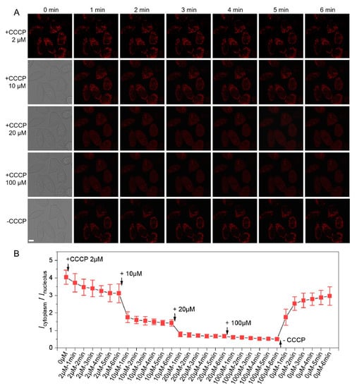 To confirm the capability of PQ to evaluate MMP precisely, the cells were monitored in real-time. A series of concentrations of CCCP (2, 10, 20, and 100 µM) were introduced to live HeLa cells to induce various MMP situations and fluorescence was monitored for 30 min throughout the entire process (Figure 4A). As shown in Figure 4B, after the addition of 2 µM CCCP, MMP decreased slightly and the mean fluorescence intensity ratio of cytoplasm and nucleolus Icytoplasm/Inucleolus decreased from 4.0 to 3.1 in 6 min. When the concentration of CCCP was increased to 10 µM and 20 µM, the Icytoplasm/Inuleolus ratios continued to decrease to 1.4 and 0.7 sharply. When CCCP was in excess (100 µM), MMP tended to vanish, and the ratio decreased to the smallest value ~0.50. Theoretically, MMP recovers to a certain extent after removing all the CCCP. Experimentally, the cytoplasm fluorescence recovered but nucleoli fluorescence diminished again. The Icytoplasm/Inucleolus ratio increased rapidly to 3.0 (Figure 4B), demonstrating that the mean fluorescence intensity ratio of cytoplasm and nucleolus is positively correlated with MMP and various MMP situations can be semiquantitatively evaluated.