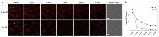 The rising of reactive oxygen species (ROS) level is an important factor causing cell inflammation and apoptosis as well as an inducer of many diseases [,]. To confirm the ability of PQ to monitor MMP in real time further, H2O2 (0.5 mM and 2 mM) was used to create an oxidative environment in which PQ-stained live cells were subjected to fluorescence imaging. As shown in Figure 6, in a low concentration of H2O2 medium (0.5 mM), the ratio decreased gradually from 3.5 to 1.3 for cell “c”; whereas, in the high concentration medium (2 mM) the ratio decreased sharply in 1 min from 3.9 to 0.9 for cell “d”, and then continued to decrease to 0.6 gradually. The results disclose that the MMP of live cells descends on a small scale at low ROS levels but drops sharply at high ROS levels until it vanishes.