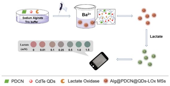 - Yang, S.; Lu, F.; Liu, Y.; Ning, Y.; Tian, S.; Zuo, P.; Ji, X.; He, Z. Quantum dots-based hydrogel microspheres for visual determination of lactate and simultaneous detection coupled with microfluidic device. Microchem. J. 2021, 171, 106801. [Google Scholar] [CrossRef]
