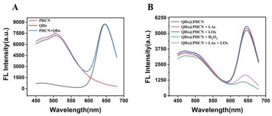 To prove the scheme, we explored the feasibility of lactate detection with Alg@PDCN@QDs-LOx MSs. In the presence of PDCN, the fluorescence intensity of CdTe QDs remained unchanged (Figure 2A). In the presence of CdTe QDs, the fluorescence intensity of PDCN also remained stable, indicating that PDCN and QDs did not affect each other. Then, the feasibility of using the mixed solution of QDs and PDCN for the detection of lactate was explored, as shown in Figure 2B. When H2O2 was added or lactate and LOx were added simultaneously, the fluorescence of QDs was effectively quenched. At the same time, the fluorescence of PDCN was nearly invariable, indicating that PDCN as a reference signal and QDs as a response signal could be used for the detection of lactate.