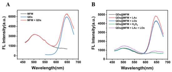 Feasibility test of Alg@MFM@QDs-LOx MSs used for lactate detection. (A) Fluorescence spectra of MFMs, QDs and MFMs + QDs. (B) Fluorescence spectra of the CdTe QDs and MFMs mixed solution with tris buffer solution, LOx, LAc (pH 8.2), H2O2, and LAc + LOx (pH 8.2). LAc: 1 mM, LOx: 0.06 U/mL, H2O2: 1 mM.