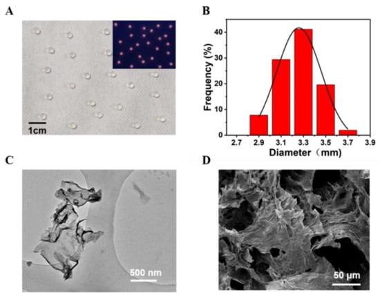 Characterization of Alg@PDCN@QDs-LOx MSs. (A) Picture of microspheres under natural light. Inset: Under a UV lamp, a photograph of microspheres. (B) The diameter distribution diagram of microspheres. (C) TEM image of the PDCN nanosheets. (D) SEM image of the microspheres.