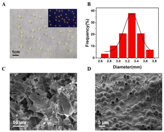 Under visible light, Alg@MFM@QDs-LOx MSs appeared as structured green spheres and emitted obvious red fluorescence at 365 nm (Figure 5A). The diameter of the microspheres was statistically analyzed (Figure 5B). Meanwhile, its average size was about 3.30 ± 0.23 mm. Alg@MFM@QDs-LOx MSs exhibited a multilayer network structure (Figure 5C), and it was clear that the embedded MFMs were attached to the microspheres (Figure 5D).