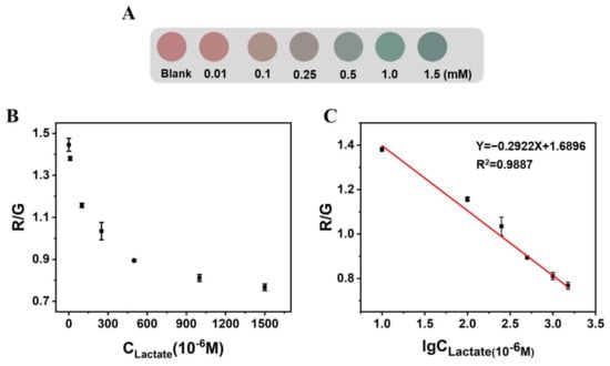 Similarly, we also explored the influence of lactate on the fluorescence color of Alg@MFM@QDs-LOx MSs, and the corresponding color card for lactate detection was prepared (Figure 7). With the addition of the lactate concentration, the fluorescence color of the microspheres changed from orange red and yellow to green. Within 10 to 1500 μM, the R/G values of Alg@MFM@QDs-LOx MSs had a linear relationship with the logarithm of the lactate concentration, and the detection limit was 1.22 μM (3σ/s).