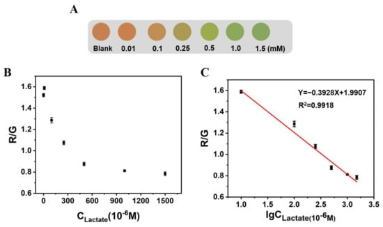 The influence of lactate on the fluorescence color and R/G value of Alg@PDCN@QDs-LOx MSs. (A) Influence of lactate on the fluorescence of microspheres. (B) The R/G value of Alg@PDCN@QDs-LOx MSs corresponding to different lactate concentrations. (C) Linear plot of the R/G value of Alg@PDCN@QDs-LOx MSs with respect to the logarithm of the lactate concentration.
