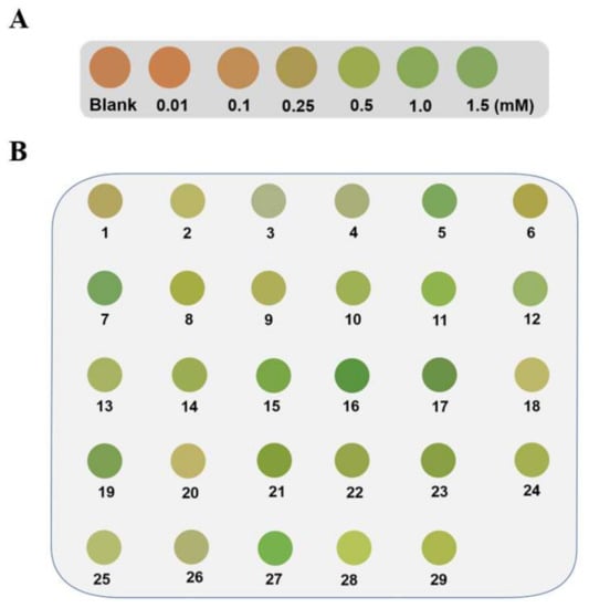 In the experiments of lactate detection, we adjusted the pH of lactate to 8.2 by adding NaOH solution. The microspheres were added to 300 μL of lactate solution and incubated at 25 ° C for 12 min. Under the UV lamp, we used the Xiaomi 8 smartphone to capture fluorescence pictures of the microspheres. Afterwards, the RGB values were obtained by the application “Color Recognizer”, and a color card for lactate detection was prepared.