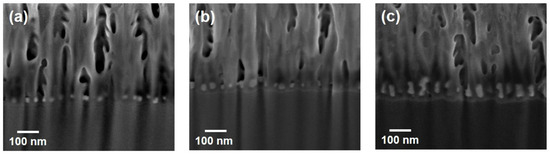 Typical cross-sectional SEM micrographs of Ag-AAO substrates with Ag-deposition cycles of (a) 6, (b) 13, and (c) 39.