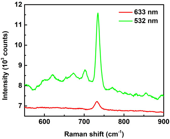 SERS spectra of adenine (concentration of 10−4 M) with excitation laser wavelengths of 633 and 532 nm. The spectra are pristine with neither intensity shift nor background subtraction. The objective lens of 50× and exposure times of 3 s were used for the measurements.